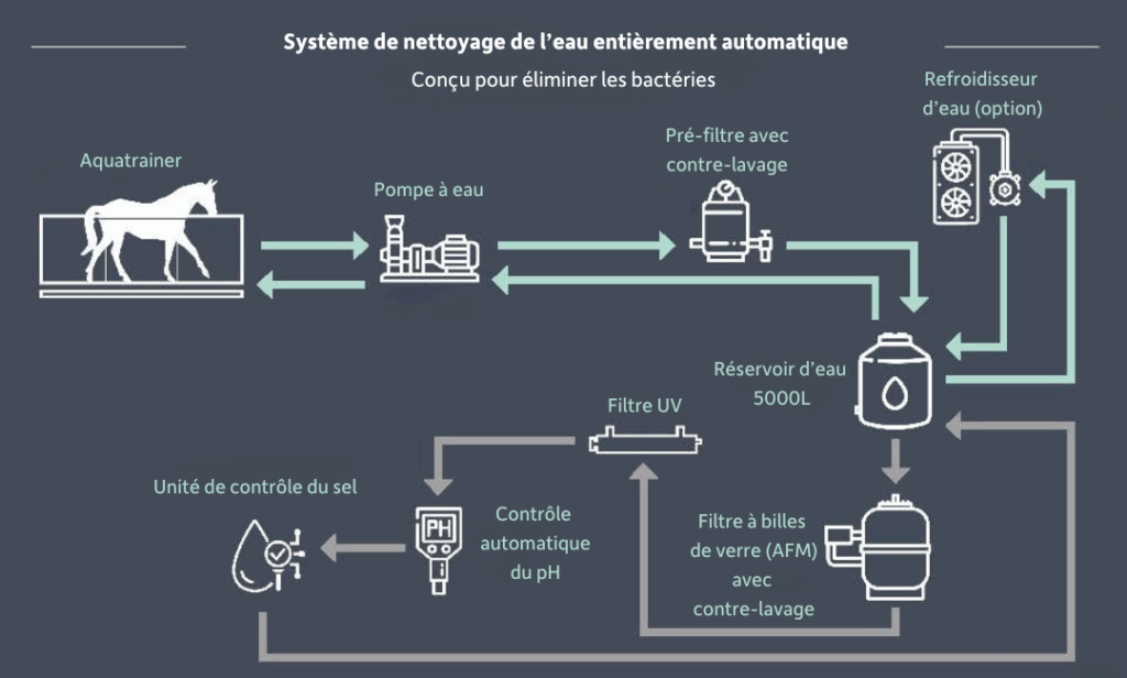 Conçue pour l’entraînement, la rééducation après une blessure ou chirurgie, et la récupération musculaire des chevaux, elle allie technologies de pointe, confort et hygiène optimale.
