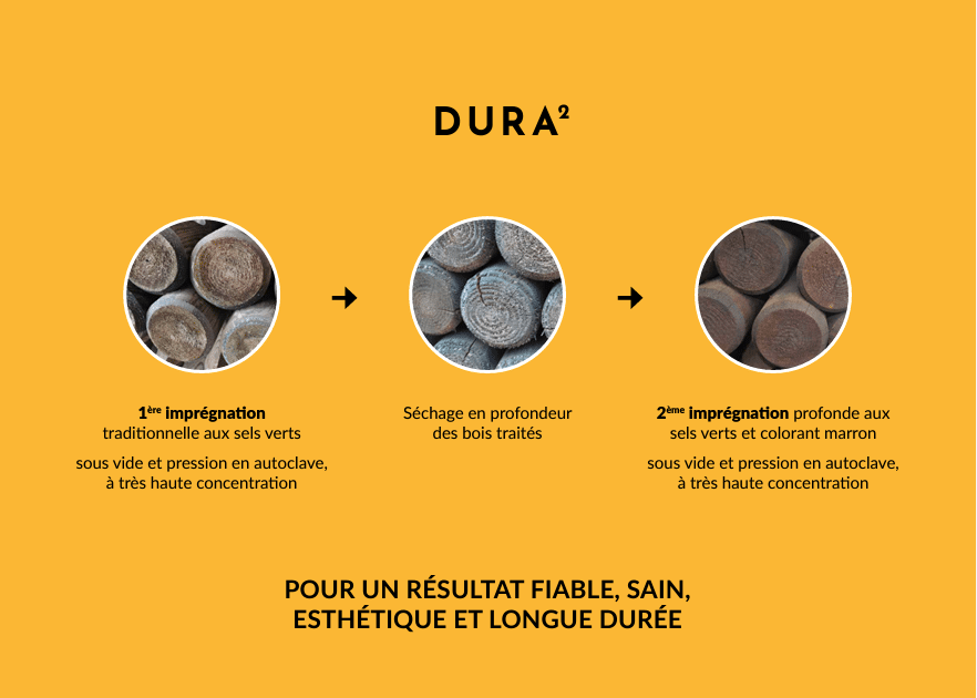 La créosote, anciennement utilisée pour le traitement du bois, est désormais reconnue comme substance cancérigène et progressivement interdite. Dura² représente une solution innovante, garantie 25 ans, respectueuse de la santé et de l’environnement, parfaitement adaptée aux usages exigeant sécurité, durabilité et fiabilité. Ce traitement premium combine une double imprégnation sous vide et pression, suivie d’un séchage profond entre les deux étapes, assurant une durabilité exceptionnelle et un bel aspect marron naturel.