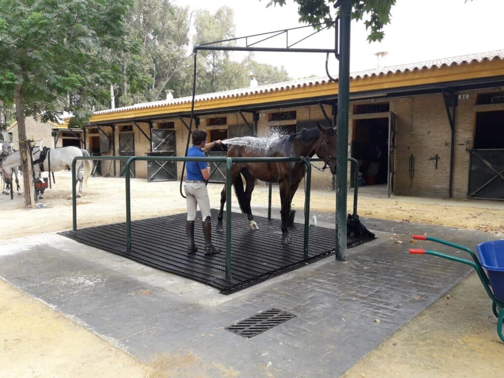 Nos tapis en caoutchouc pour douche facilitent l'évacuation des liquides grâce à leurs rainures. Antidérapant avec un drainage permanent, vos chevaux seront en sécurité lors de leur douche. Le sabot des chevaux restent au sec, garantissant une stabilité optimale et évitant l'inconfort.