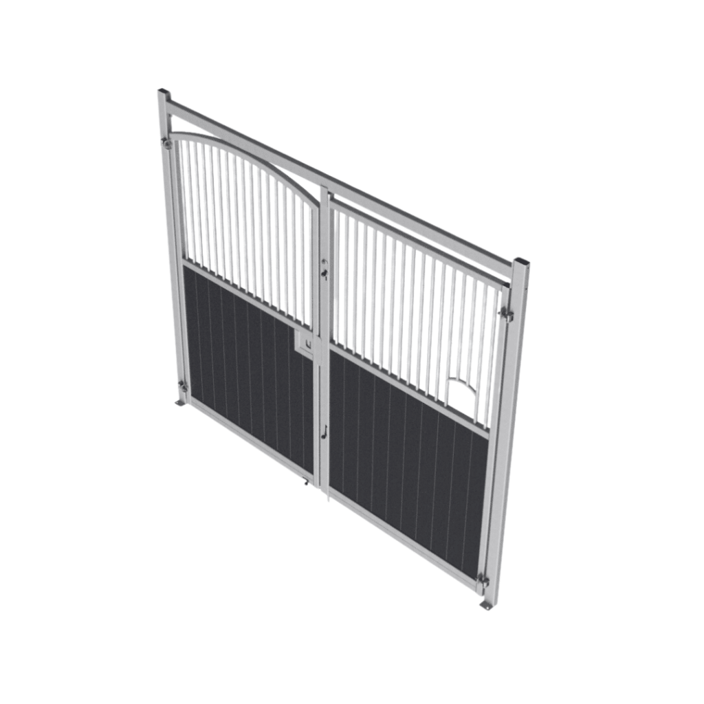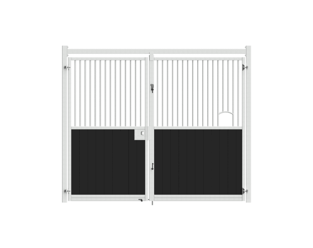 La façade de box Bravo se distingue par ses portes battante à ouverture totale – 180°. L’alliance d’une structure en acier galvanisé à chaud avec cadre de renfort, de solides barreaux et d’un remplissage avec des planches en résine plastique 32 mm en fait une façade de box idéale pour les écuries à la recherche de solidité et de fonctionnalité. Dotée d’un système de loquet à doigt accessible des deux côtés et de deux verrous de sécurité, elle garantit à la fois praticité et sécurité. La partie barreaudée est équipée d’un passage d’accès à la mangeoire.