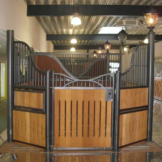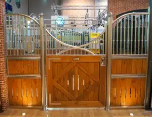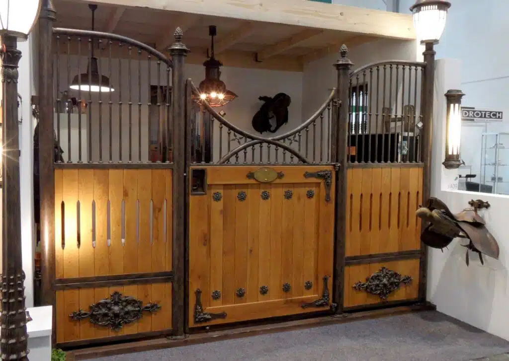 La façade de box Enca se distingue par sa courbe harmonieuse et son design exceptionnel. La structure en acier galvanisé à chaud (norme DIN EN ISO 1461), le remplissage ajouré en bois exotique dur ou en bambou 38 mm et les finitions arrondies soignées, en fait une façade idéale pour les écuries à la recherche d’aménagements prestigieux et fonctionnels. Équipée d’une porte battante grand passage, de barreaux sertis et décorés et d’un accès à la mangeoire, la façade de box de luxe Enca répond aux attentes des haras, des écuries de sport, des écuries de propriétaires…en quête d’exclusivité.