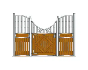 Avec sa forme galbée haute et son style particulièrement travaillé et unique, la façade de box pour chevaux Enca allie design ornemental, robustesse et fonctionnalité professionnelle. Conçue en acier galvanisé à chaud et bois dur avec fentes d'aération, elle garantit sécurité, circulation d'air et confort d’usage au quotidien.