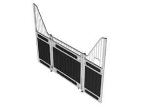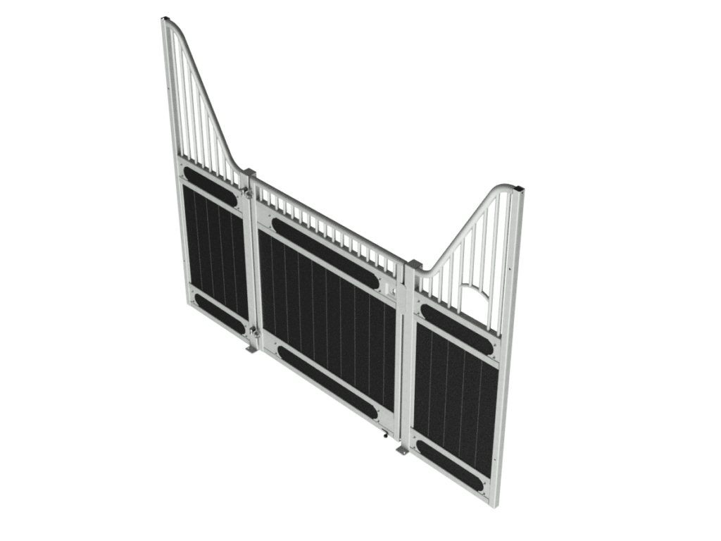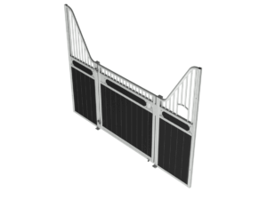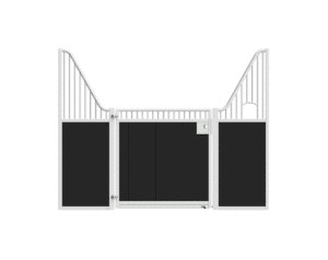 Conçue pour allier élégance, facilité d’utilisation et solidité, la façade de boxe India composée en 3 éléments se distingue par son style galbé harmonieux sur les éléments latéraux. Sa structure en acier galvanisé à chaud garantie une excellente résistance à l’humidité et aux contraintes quotidiennes des environnements équestres. Les planches en résine plastique 32 mm, montées en tenon-mortaise, les solides barreaux Ø 26,9 mm assurent robustesse et sécurité à l’ensemble. La porte centrale est dotée d’un système d’ouverture et de fermeture à loquet à doigt et offre un grand passage de 1,40 m. Les barreaux intègrent une ouverture galbée pour un accès rapide à la mangeoire.