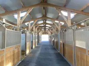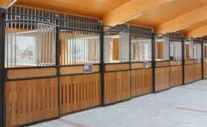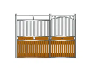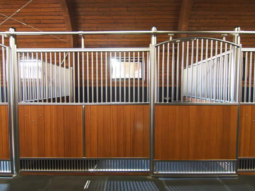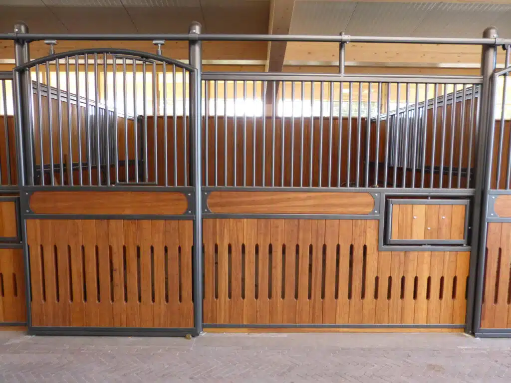 Idéale pour les écuries à couloirs étroits, la façade de box coulissante cintrée Kandel combine praticité, robustesse et fabrication soignée. Son ossature en acier galvanisé à chaud (norme DIN EN ISO 1461) associée à un remplissage en bois exotique dur ou en bambou, garantit une excellente résistance à un usage intensif et aux chocs. La porte coulissante silencieuse au design cintrée s’ouvre d’une seule main grâce à un barreau télescopique à ressort, assurant maniement fluide et sécurisé. Le passage de tête avec portillon permet au cheval une visibilité sur l’allée centrale. L’ouverture à aliment discrètement intégré dans le bandeau horizontal décoratif facilite le remplissage de la mangeoire.