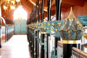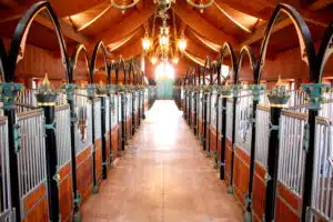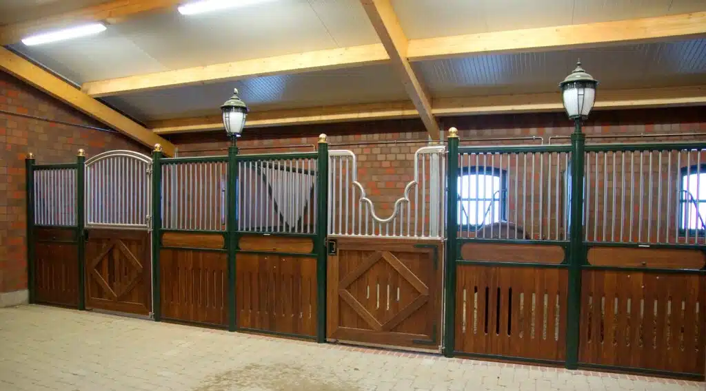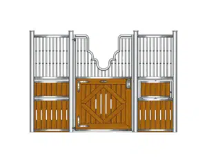 La façade prestigieuse Lebenstraum incarne l’excellence des installations équines haut de gamme. Sa porte de box centrale battante à la forme unique, décorée d’un motif losange, lui confère un style raffiné et une forte identité visuelle. Fabriquée en acier galvanisé à chaud (norme DIN EN ISO 1461) et équipée de planches en bois exotique dur ajouré, elle garantit résistance, ventilation et esthétique premium à vos installations. Les barreaux sertis et décorés, les finitions arrondies, les poteaux ronds, le système d’ouverture spécial et l’accès à la mangeoire tournant témoignent d’une conception pensée pour la sécurité, le confort du cheval et l’efficacité au quotidien.
