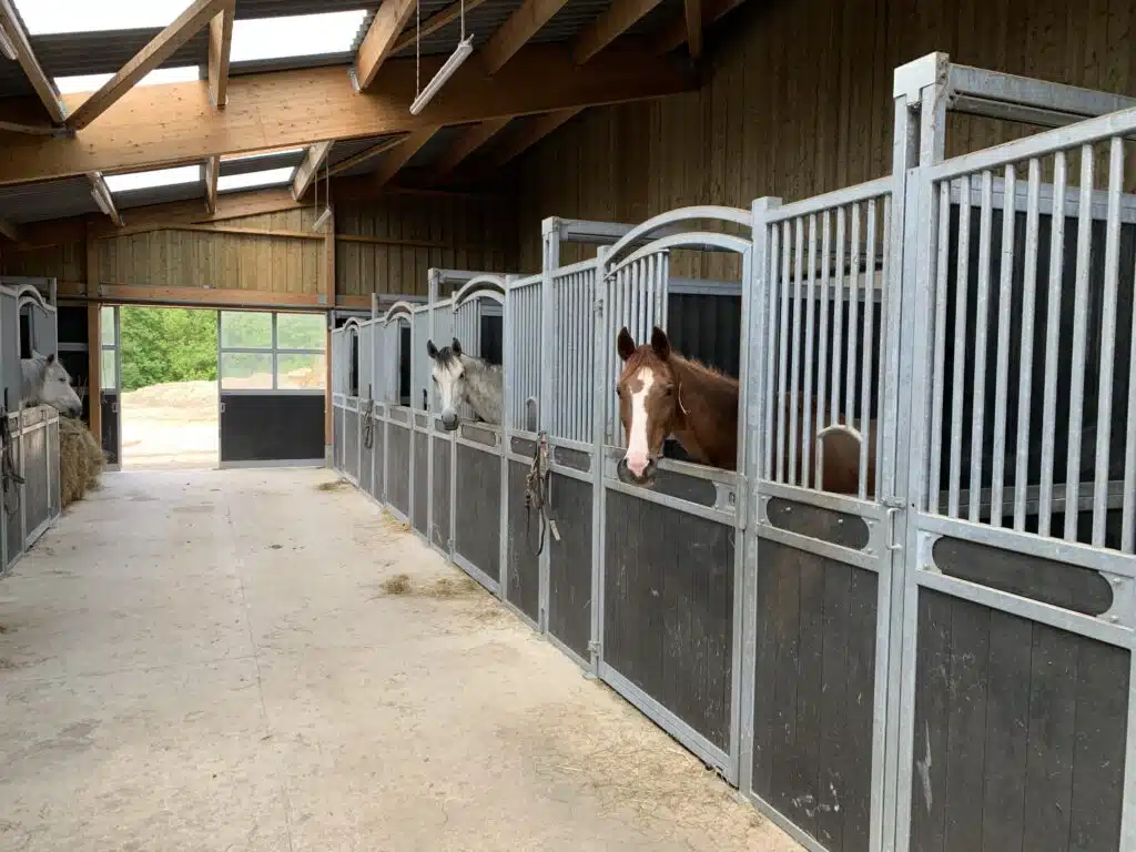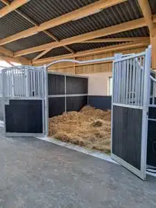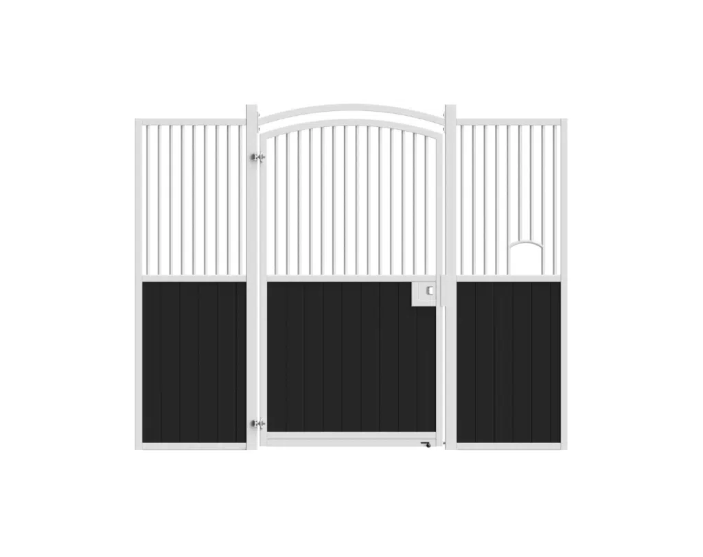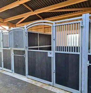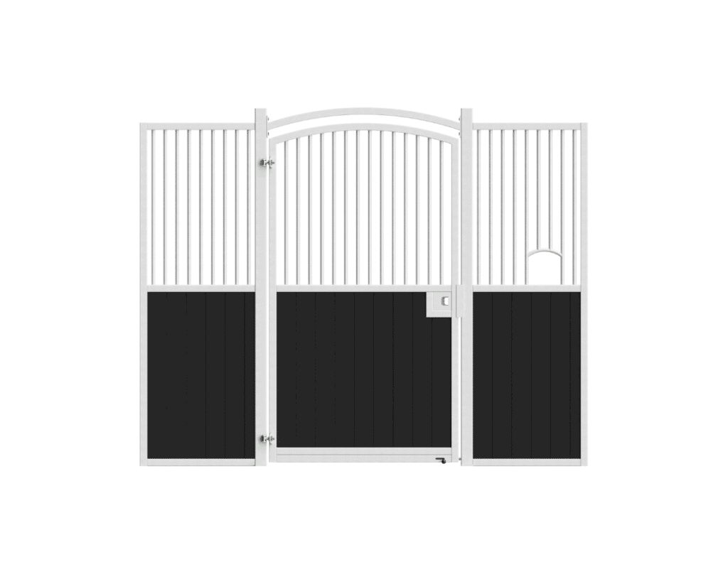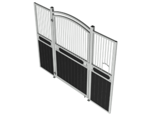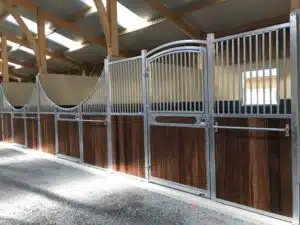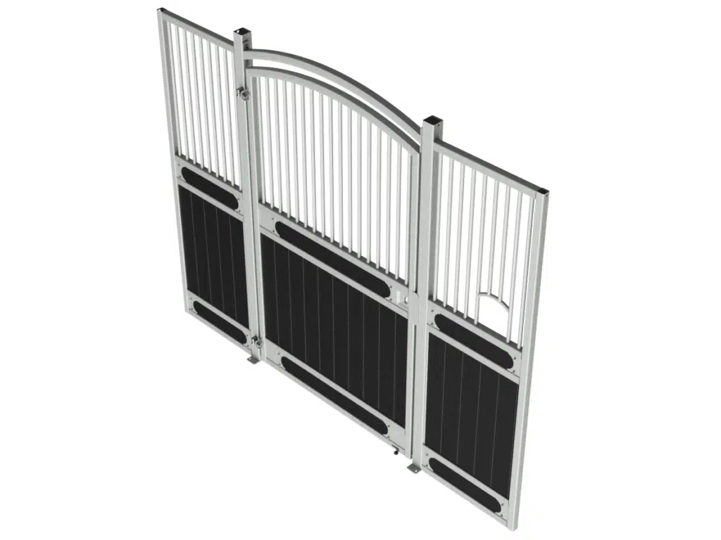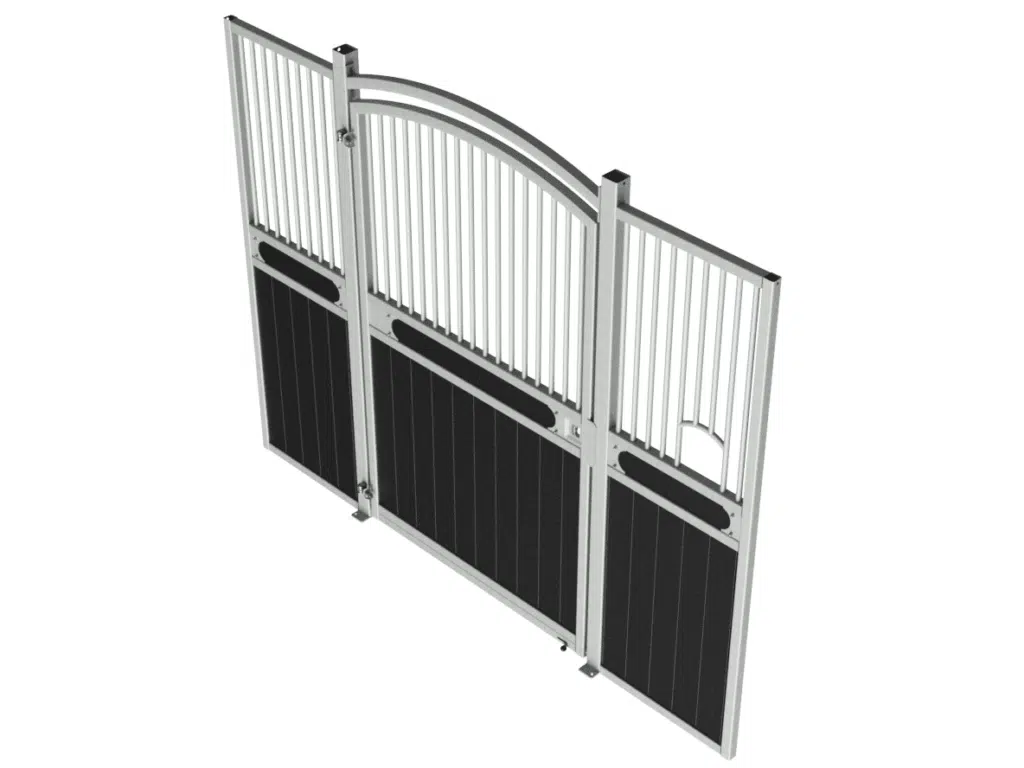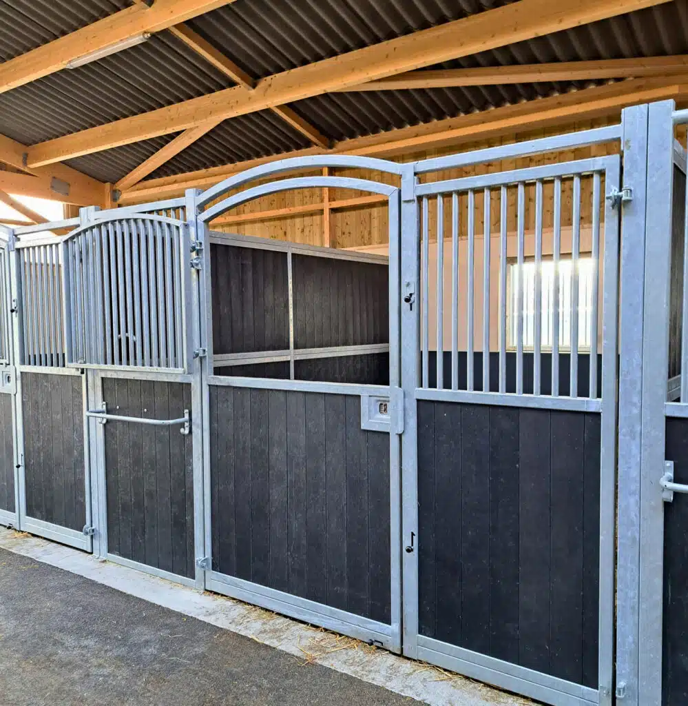 La façade de box Lima avec porte battante centrale allie une silhouette cintrée élégante à un grand confort d’utilisation au quotidien. Son design sobre, sa large ouverture et ses finitions soignées en font un choix idéal pour les écuries à chevaux modernes. Réalisée sur mesure, elle s’adapte à tous les projets d’aménagement.