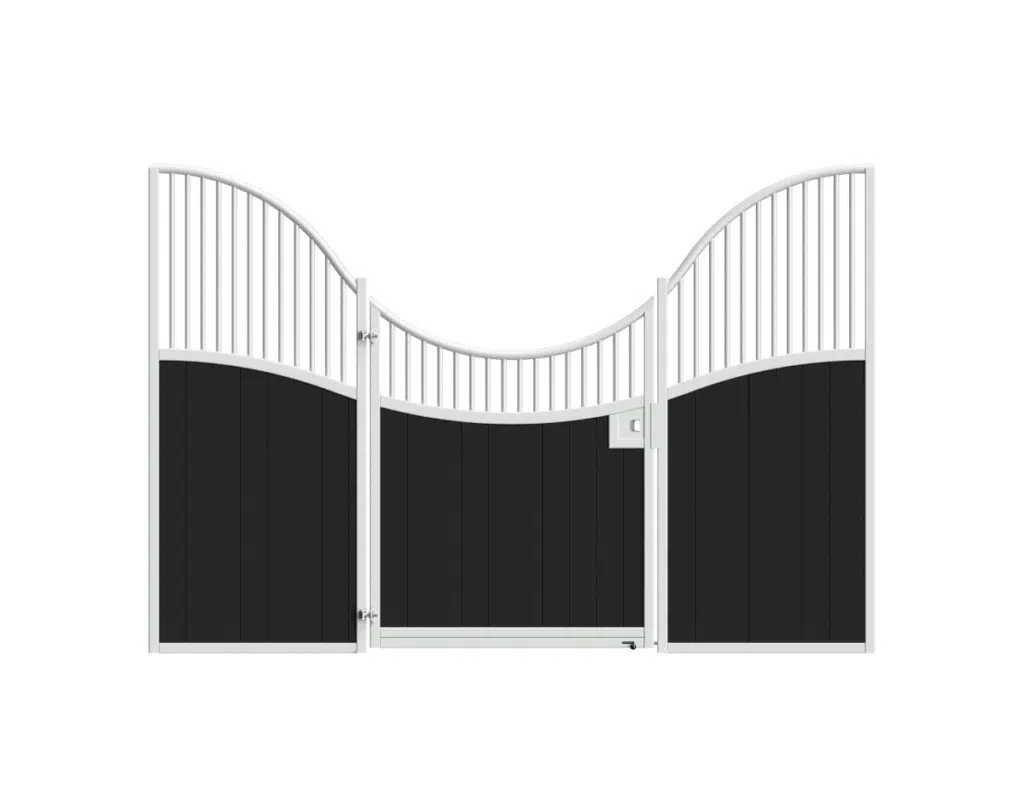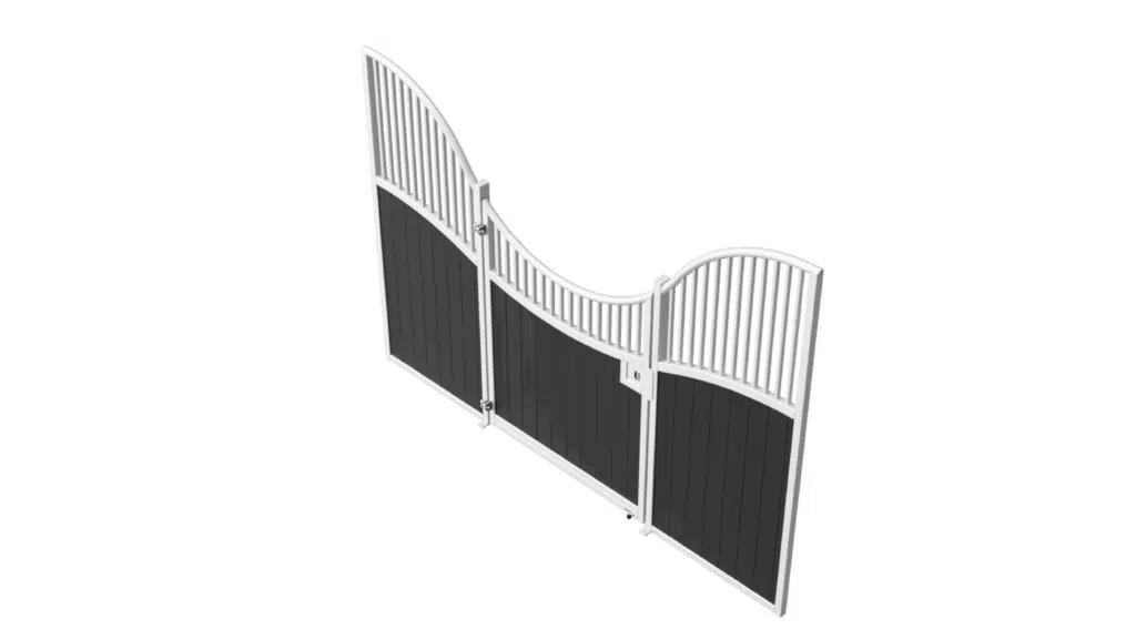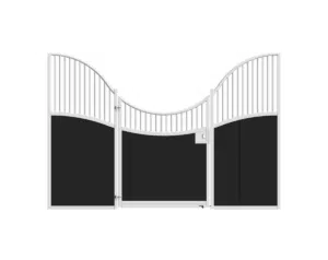 La façade de box Sierra Zulu se distingue par sa porte battante centrale et sa forme incurvée. L’alliance d’une structure en acier galvanisé à chaud, de solides barreaux et d’un remplissage avec des planches en résine plastique 32 mm en fait une façade idéale pour les écuries à la recherche de solidité et de fonctionnalité. Offrant un grand passage de porte, une ouverture et un verrou bas de sécurité, elle garantit simplicité d’usage et sécurité.