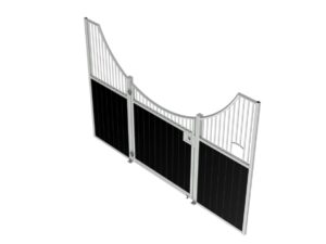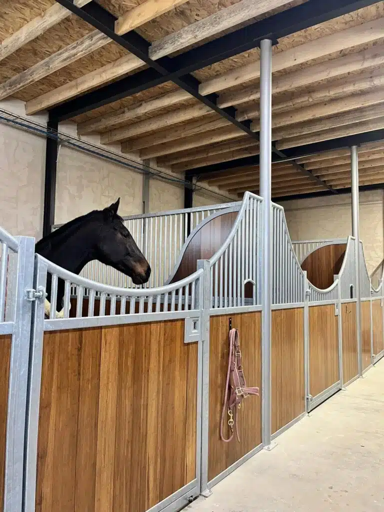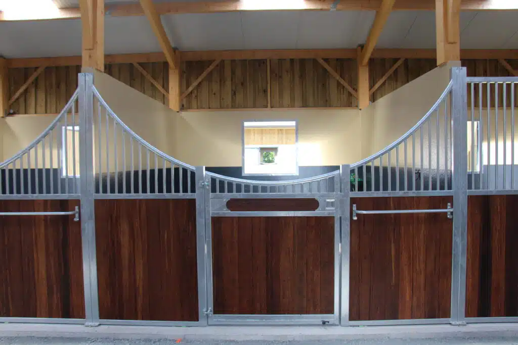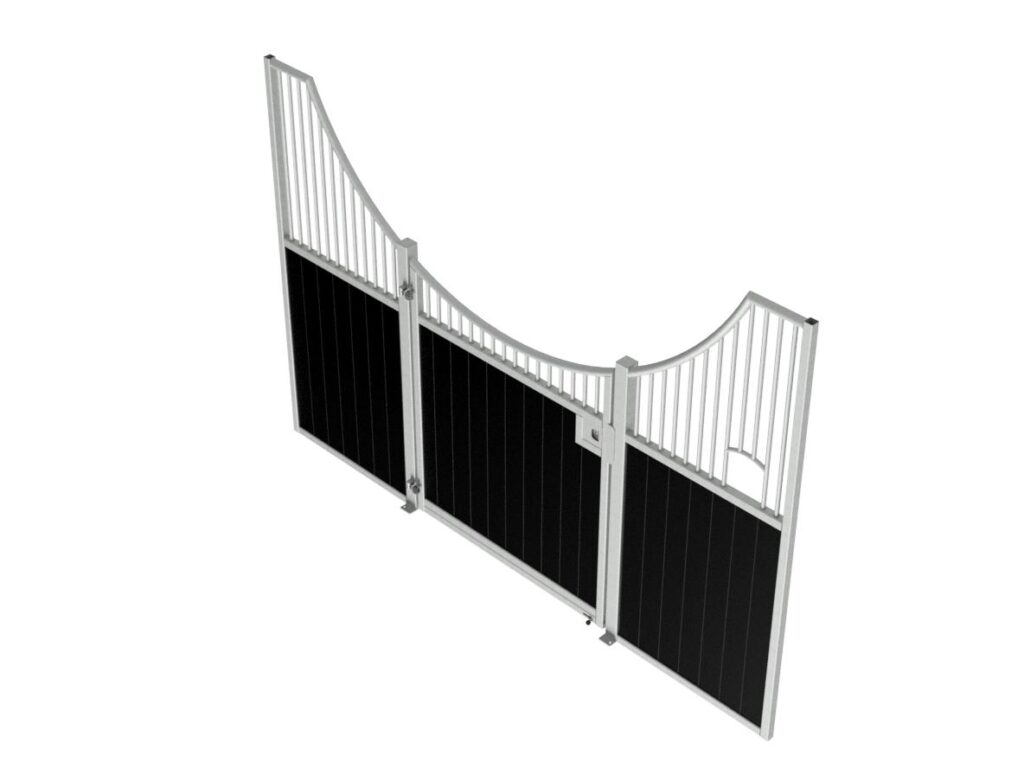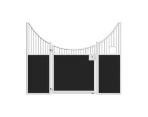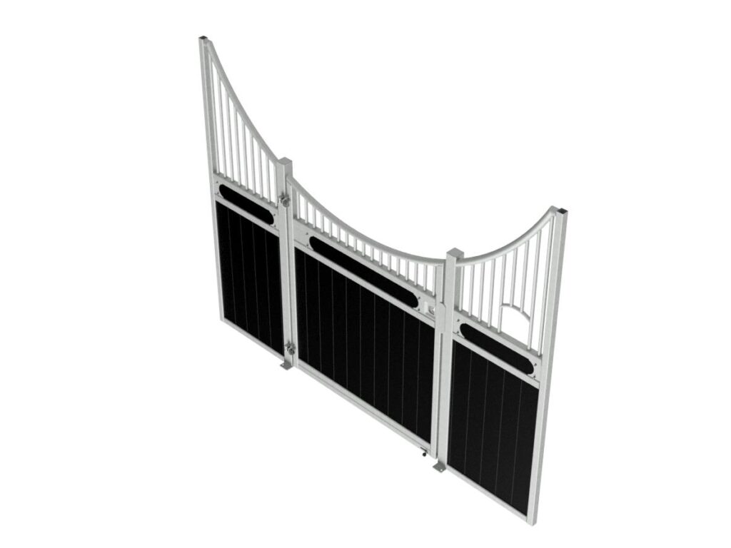 Élégante et fonctionnelle, la façade de box Sierra séduit par sa forme galbée en demi-lune, sa large ouverture de porte et ses finitions soignées. Fabriquée sur mesure, elle est idéale pour créer une ambiance chaleureuse dans toutes les écuries.