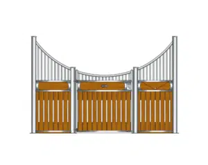Avec son galbe en demi-lune, la façade de box Störtebeker apporte une ambiance ouverte et chaleureuse dans les écuries. Sa porte battante centrale galbée assure un large dégagement au passage, pratique pour le cheval et pour le cavalier. Composée de 3 éléments en acier galvanisé à chaud (norme DIN EN ISO 1461), elle est conçue pour durer, même en environnement intensif. Le remplissage en bois exotique ajouré, les barreaux sertis font de cette façade de box un modèle robuste et élégant. Le bandeau décoratif en bois est équipé d’une ouverture discrète, pour accéder à la mangeoire.