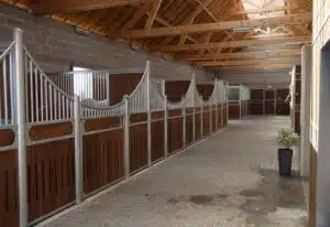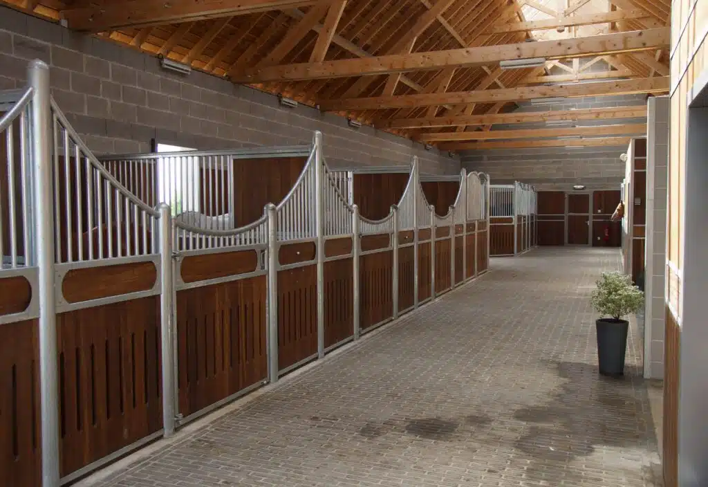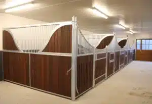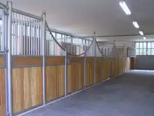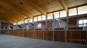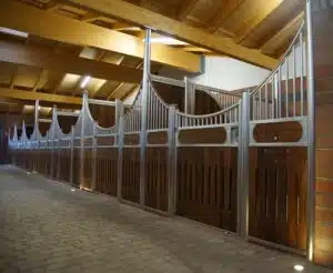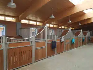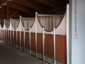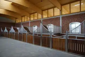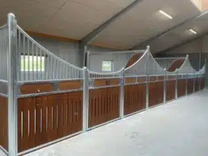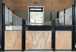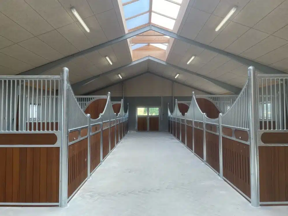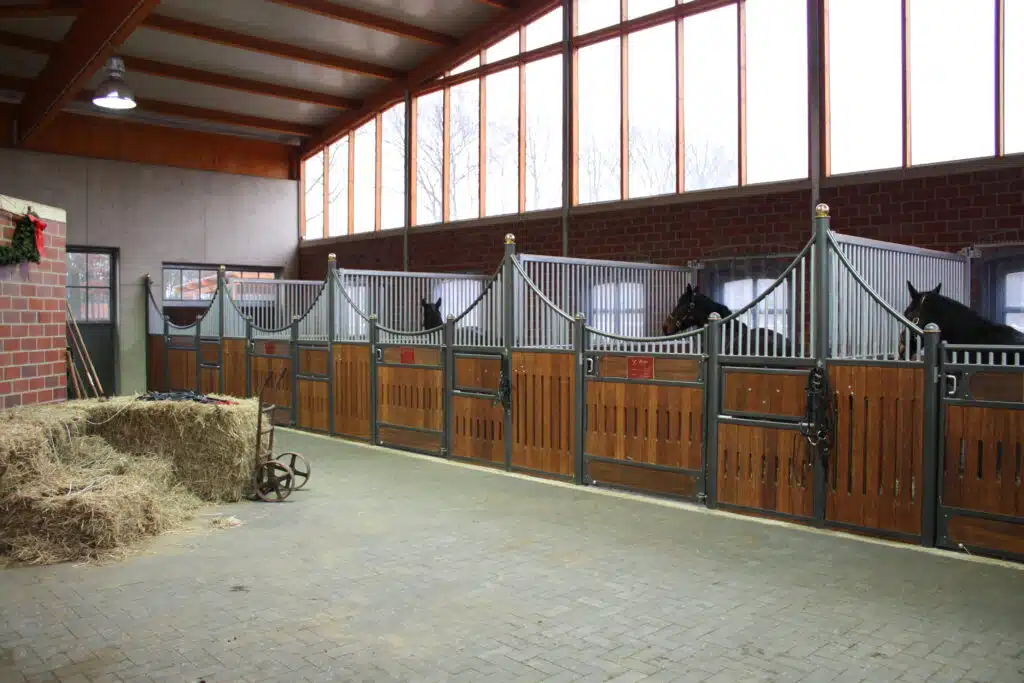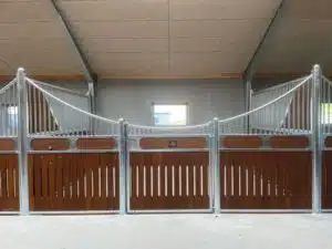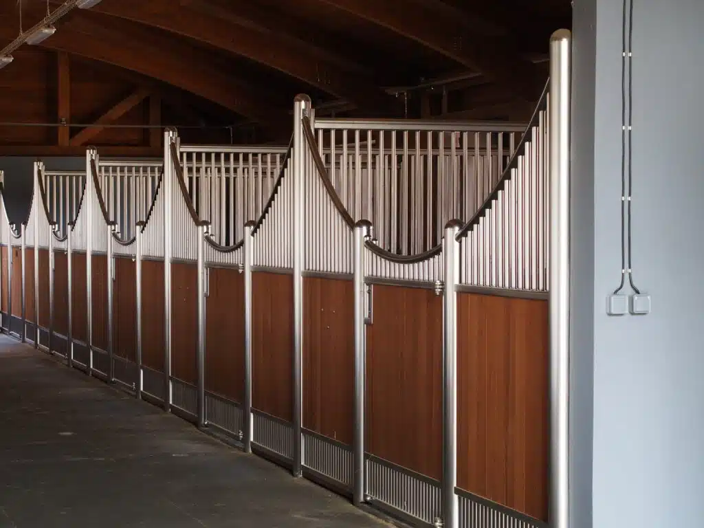 Élégante et fonctionnelle, la façade de boxes Störtebeker séduit par sa forme galbée, sa large ouverture de porte et ses finitions soignées. Idéale pour créer une ambiance chaleureuse dans tout type d’écurie, elle est entièrement personnalisable et fabriquée sur mesure.