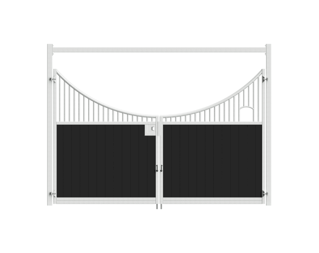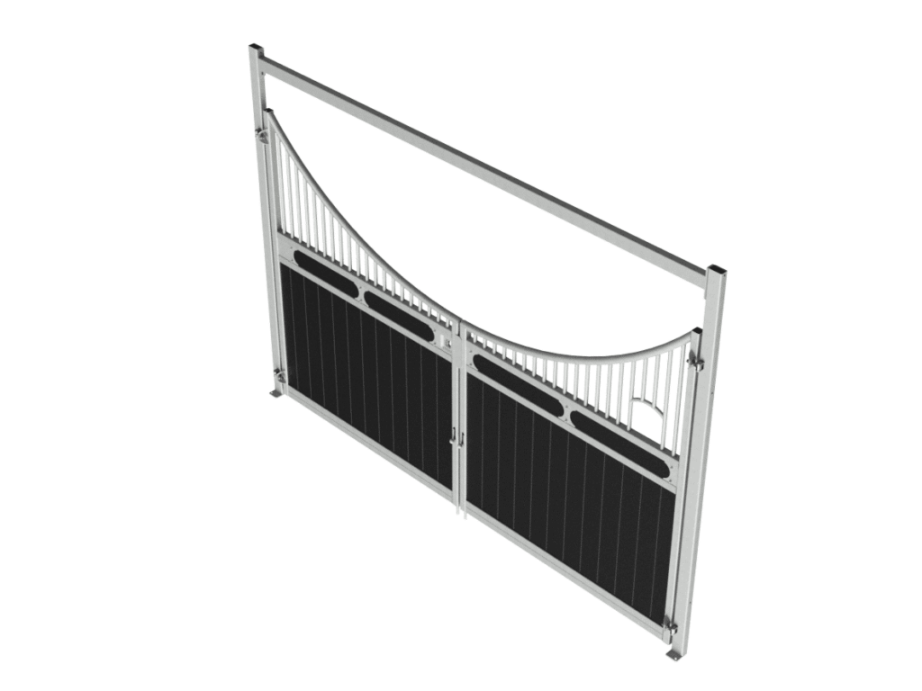 Avec son galbe en demi-lune, la façade de box Tango apporte une ambiance ouverte et chaleureuse dans les écuries. Ses portes totalement ouvrantes à 180° assurent un large dégagement. Composée de 2 éléments en acier galvanisé à chaud avec cadre de renfort, elle est conçue pour durer, même en environnement intensif. Le remplissage en résine plastique, les solides barreaux, le système d’ouverture à loquet à doigt, le verrou bas de sécurité et l’accès à la mangeoire font de cette façade un modèle robuste, sécurisé et fonctionnel. La finition arrondie souligne la qualité de fabrication.
