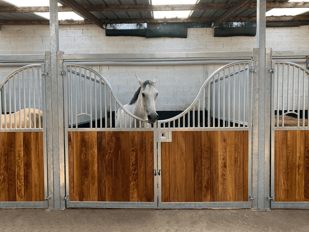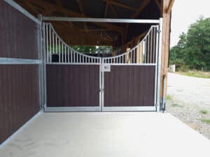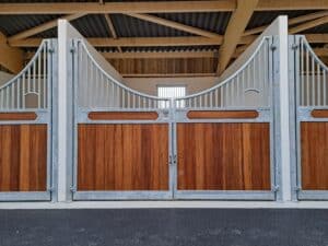 Élégante et fonctionnelle, la façade de box Tango séduit par sa forme galbée, sa large ouverture de portes et ses finitions soignées. Idéale pour créer une ambiance chaleureuse dans tout type d’écurie, elle est entièrement personnalisable et fabriquée sur mesure.