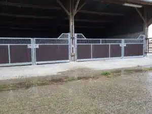 Fabriquée en acier galvanisé à chaud, avec des planches en résine 32 mm et des poteaux de renfort, elle offre une durabilité exceptionnelle, parfaitement adaptée aux conditions d’utilisation intensives en environnement équestre.
