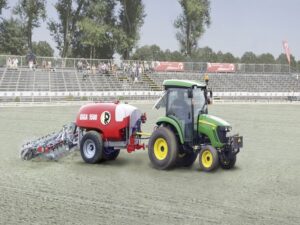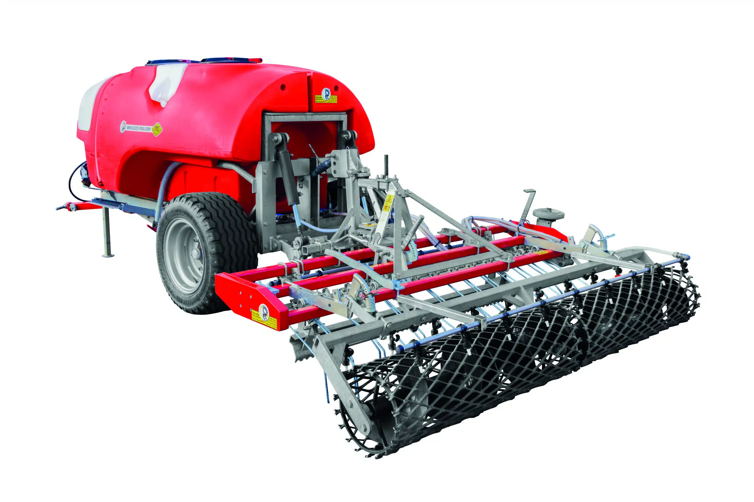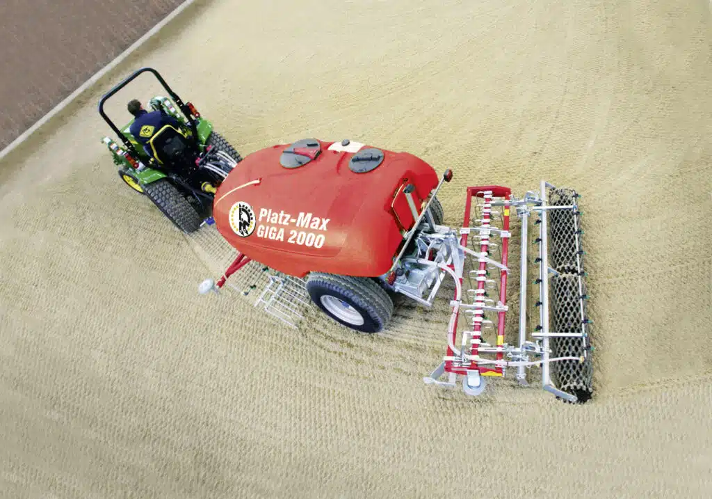 Le Platz-Max Giga dispose d’un module d’irrigation indépendant fixé à l’avant, suivi d’une herse NL ou NLSM à l’arrière. Cette configuration modulable garantit un entretien efficace et adapté aux grandes surfaces.