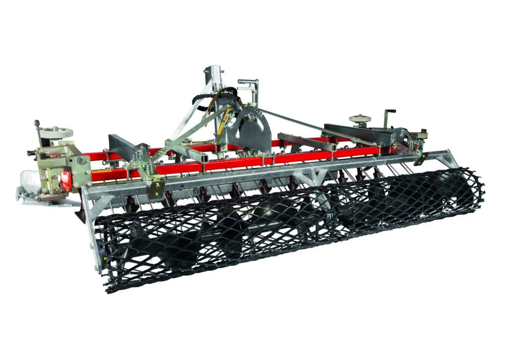 Attelage suiveur Barre de nivellement réglable Socs piocheurs avec mise en place hydraulique (Pour un travail des sols en profondeur) 2 rangées de dents réglables Rouleau à grille 2 socs de bordure escamotables (droite/gauche) 2 roulettes de protection réglables(droite/gauche) |