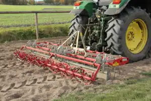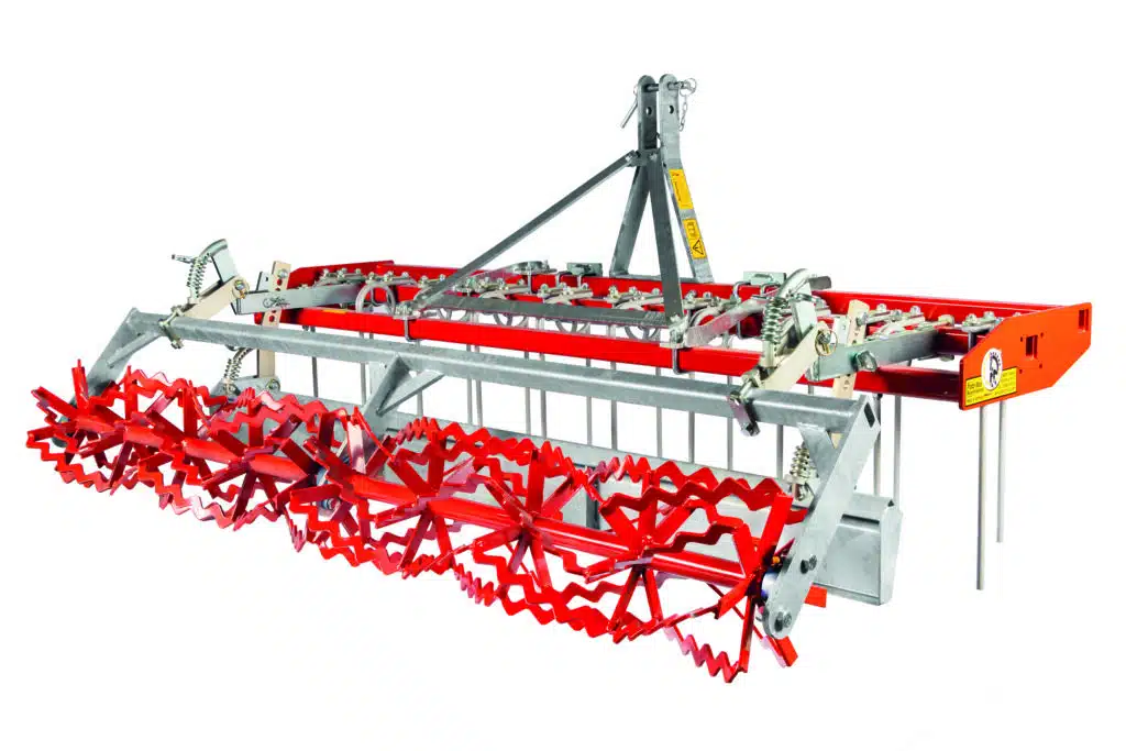 | Attelage 3 points rigides 2 rangées de dents Ø13mm Planche niveleuse réglable Rouleau émietteur Ø 280mm (K) Sans soc de bordure Sans roulette de protection |