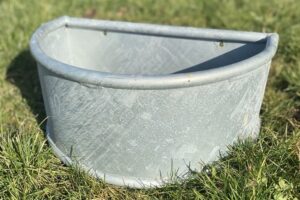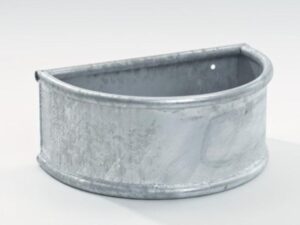 Mangeoire semi-circulaire en acier galvanisé pour chevaux, avec bords en tube rond pour une protection optimale. Version robuste et stable.