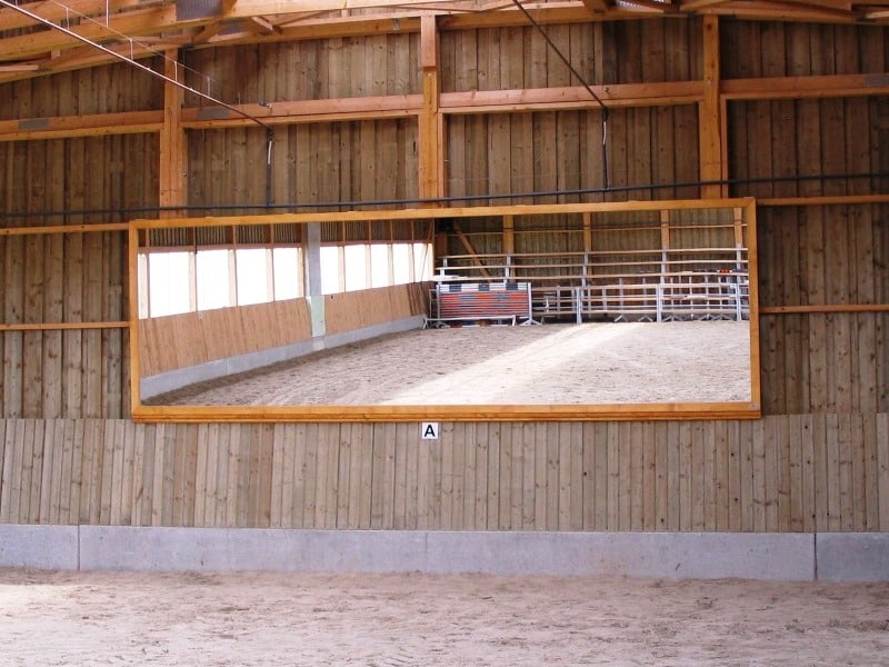 Miroir de manège équestre de grande qualité conçu pour parfaire la virtuosité du cavalier et de son cheval en toute sécurité. Extrêmement résistant avec un rendu de l'image sans déformation, il répond aux exigences de tous les cavaliers.