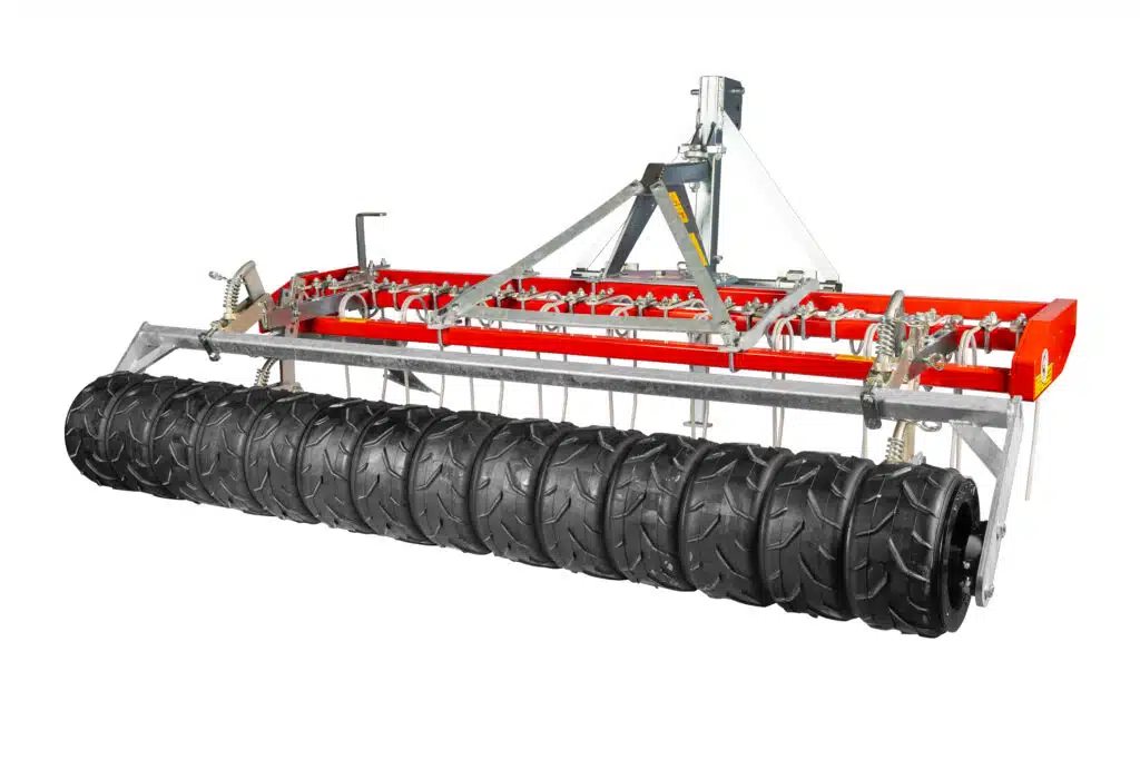 | Machine tractée sur châssis hydraulique 2 rangées de dents Planche niveleuse réglable Rouleau 1 soc de bordure 1 roulette de protection réglable à droite |