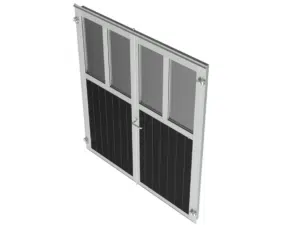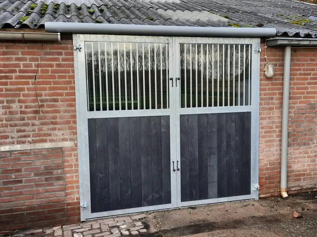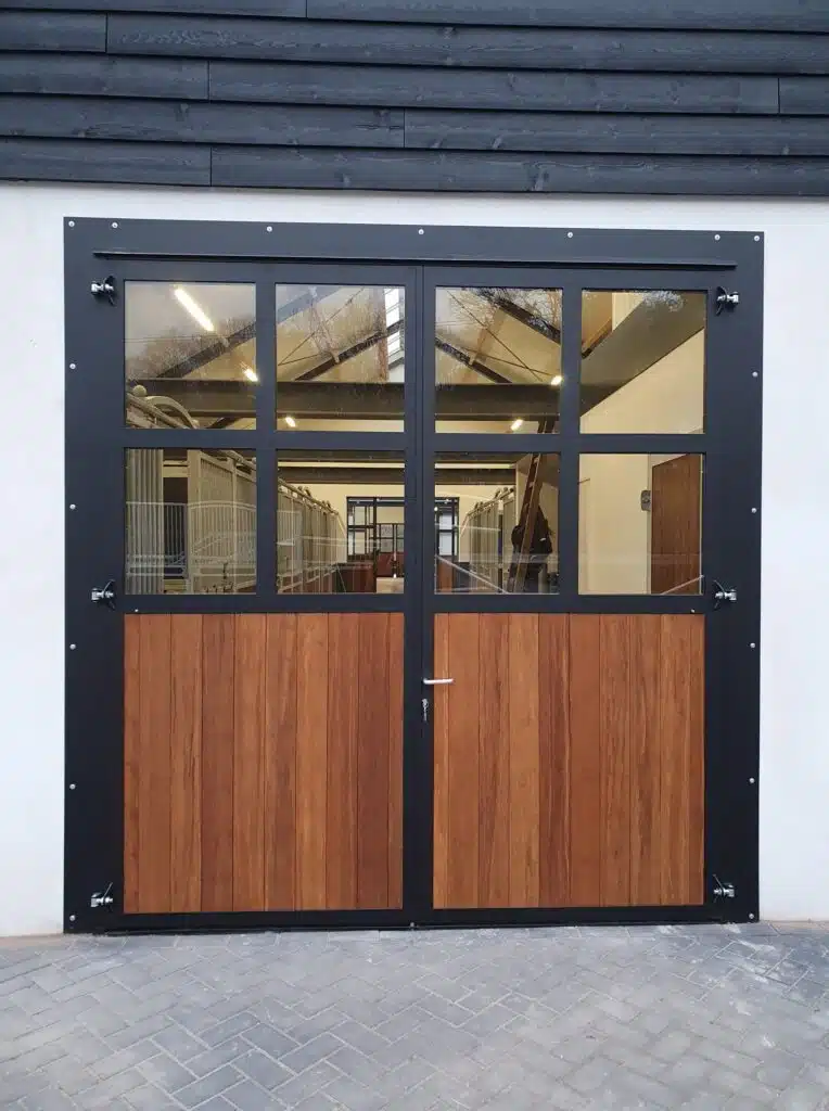 Composée d’une ossature en acier 6 mm avec huisserie cadre 100 x 50 mm galvanisé à chaud et d’un remplissage en résine plastique, les portes d’écurie deux battants Van den Oetelaar garantissent robustesse, durabilité et résistance face aux conditions exigeantes des environnements équestres. Les différentes options de personnalisation permettent de créer un style harmonieux et chaleureux adapté à chaque structure.