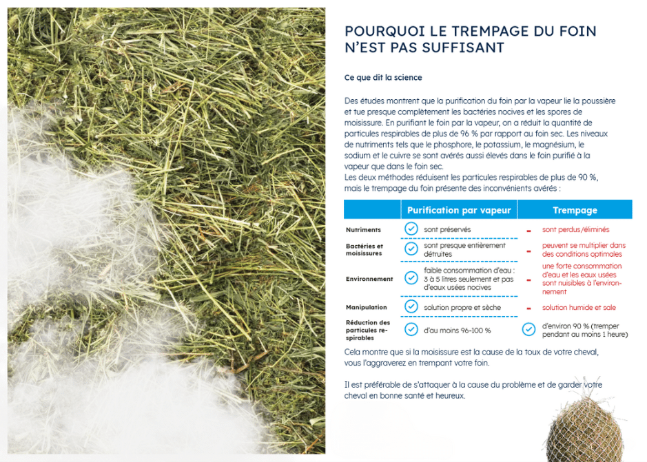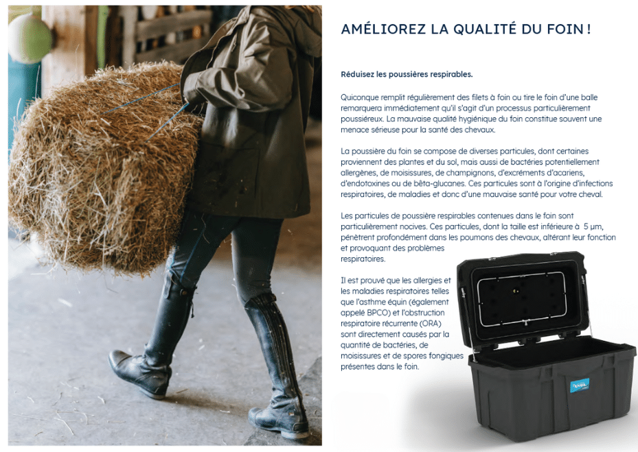 Le purificateur de foin représente la seule méthode validée scientifiquement pour purifier le foin. En améliorant la qualité du fourrage, il réduit les risques sanitaires liés à l’inhalation de poussières, spores, moisissures et agents pathogènes. Offrez à vos chevaux un fourrage appétent et nutritif grâce à cette innovation.