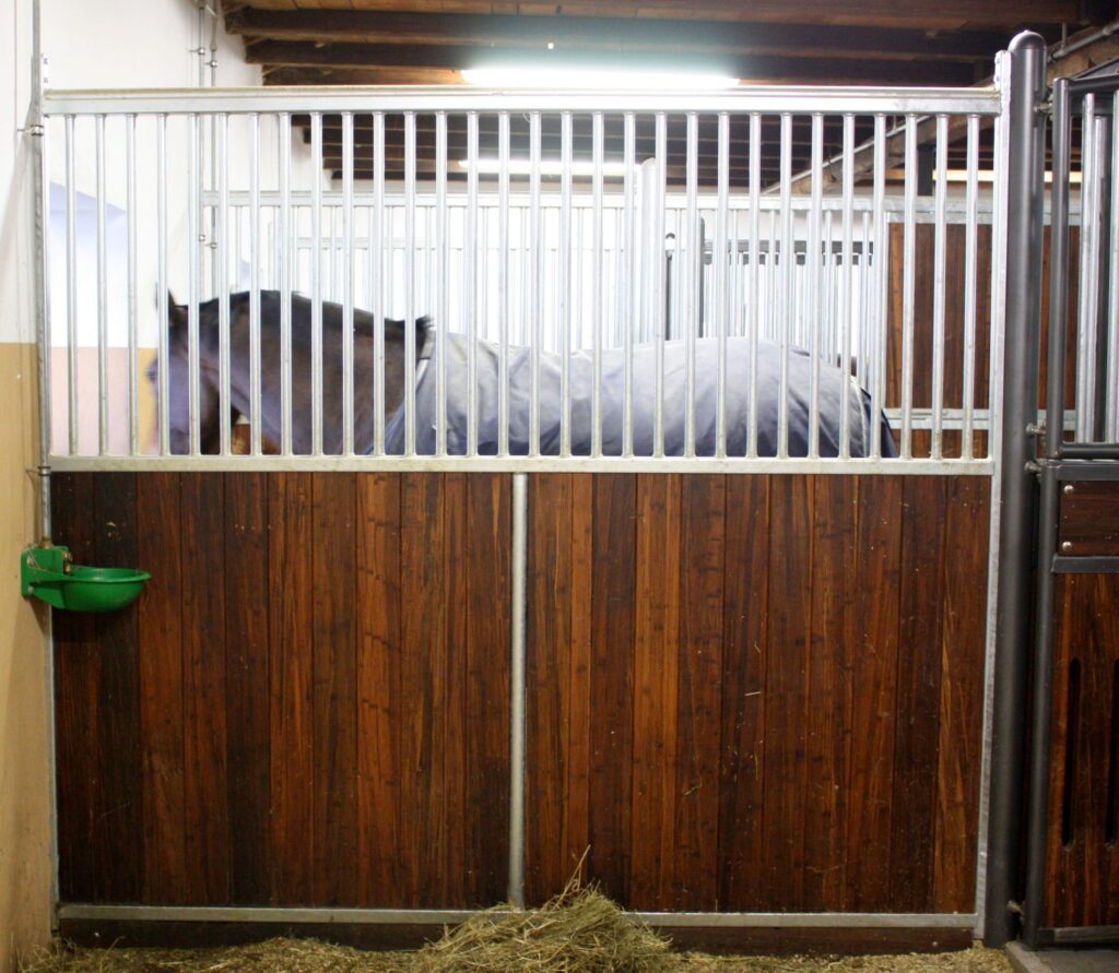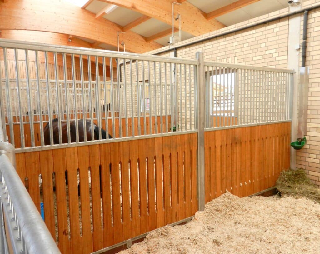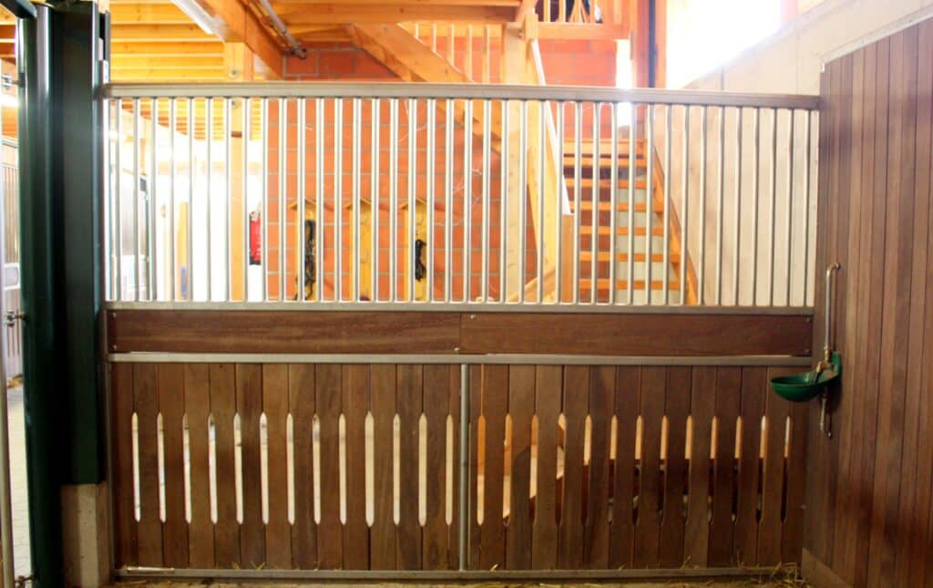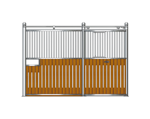 La séparation de box barreaudée combine solidité, sécurité et convivialité entre chevaux. Elle favorise l’interaction entre les chevaux, une bonne circulation de l’air et de la lumière, tout en offrant un environnement sécurisé pour chaque cheval. L’acier galvanisé (norme DIN EN ISO 1461) et le remplissage inférieur en bois exotique dur de 38 mm garantit une excellente résistance aux chocs. Les barreaux sertis, le tube supérieur arrondi de 42 mm et la semelle de finition en bois dur de 30 mm témoignent du soin apporté aux détails de finition et à la durabilité des équipements.