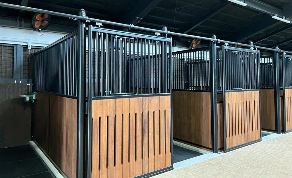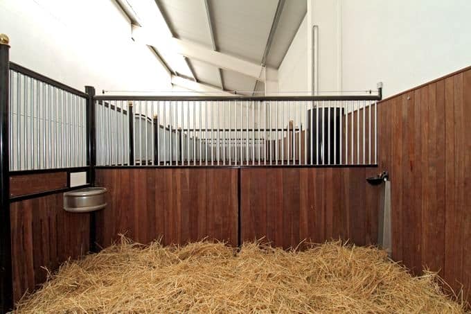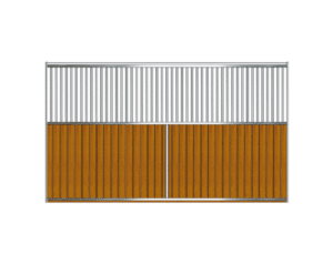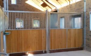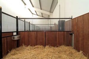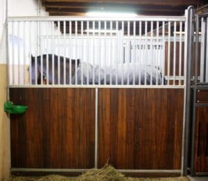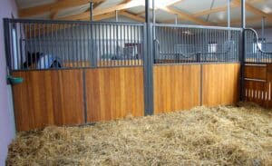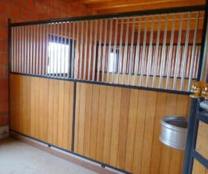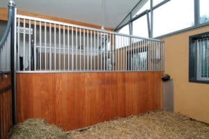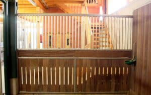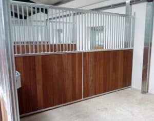 Séparation de box pour chevaux totalement barreaudée sur la partie haute, remplissage bas avec planches en bois exotique dur 38 mm. Permet le contact entre les chevaux et une meilleure luminosité dans l’écurie.