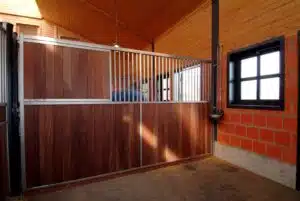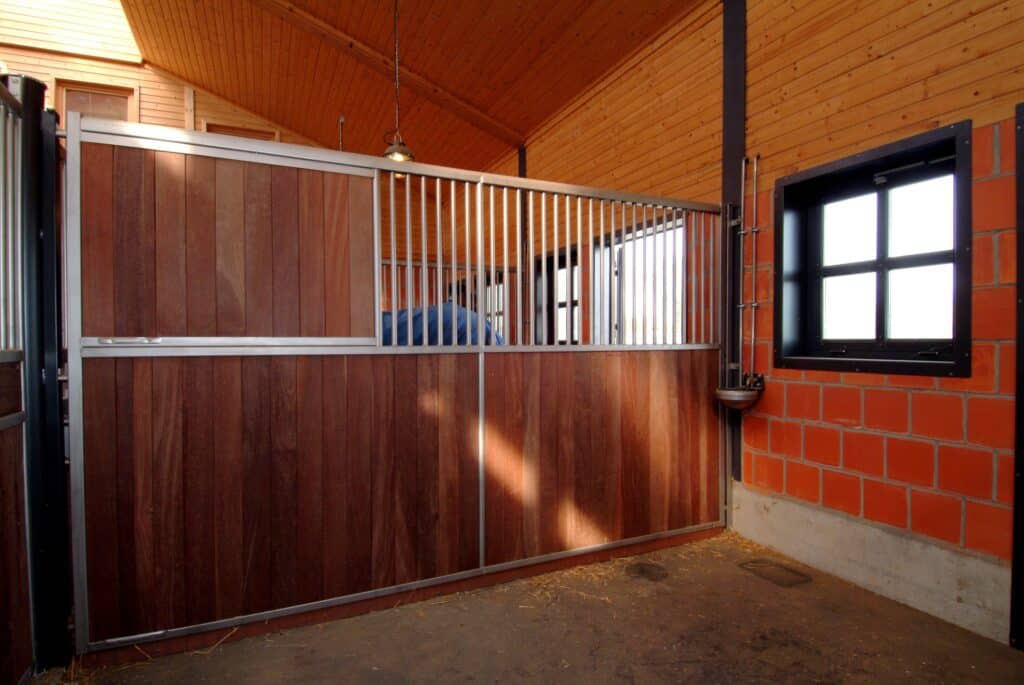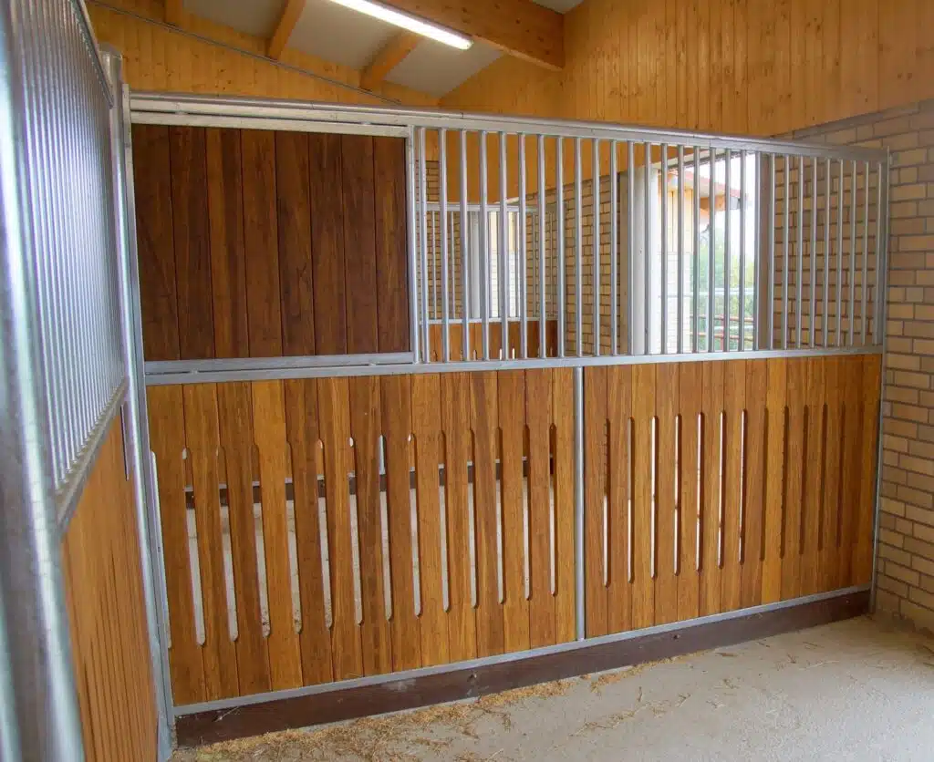La séparation de box fermée 1/3 est conçue pour répondre aux exigences des écuries en matière de sécurité, de confort et d’hygiène. Elle se distingue par sa combinaison harmonieuse d’une partie inférieure pleine et d’une partie supérieure barreaudée fermée sur 1 m, permettant l’interaction visuelle entre les chevaux et intimité lors des repas. La structure métallique galvanisée à chaud (norme DIN EN ISO 1461) garantit une résistance durable face à l’humidité, aux chocs et à l’usure quotidienne. L’habillage en bois exotique dur ou en bambou, assure robustesse en partie basse. Les barreaux sertis, le tube supérieur arrondi de 42 mm et la semelle de finition en bois dur de 30 mm témoignent du soin apporté aux détails de finition et à la durabilité des équipements.