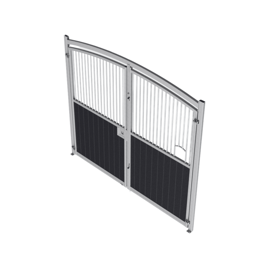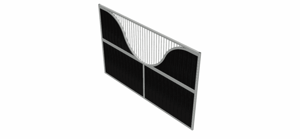 Cette séparation de box se distingue par son design incurvé symétrique, qui offre à la fois intimité entre chevaux et visibilité maîtrisée. La partie supérieure ajourée, dotée de barreaux verticaux, favorise la circulation de la lumière et de l’air, tout en garantissant sécurité. Sa structure en acier galvanisé à chaud assure une excellente résistance à l’humidité, aux chocs et à l’usure. Le remplissage en résine plastique, assemblé en tenon-mortaise, renforce la solidité de l’ensemble.