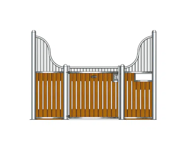 La séparation de box galbée 1/3 assure un équilibre optimal entre style, intimité et praticité. Sa forme galbée favorise un environnement apaisant, en limitant les tensions entre chevaux pendant les repas, tout en préservant une visibilité partielle et sécurisée. La structure robuste en acier galvanisé à chaud (norme DIN EN ISO 1461) résiste aux sollicitations intensives, garantissant longévité et facilité d’entretien. Le remplissage en bois exotique dur ou en bambou est pensé pour supporter les chocs et offrir un aspect naturel. Les barreaux sertis, le tube supérieur arrondi de 42 mm et la semelle de finition en bois dur de 30 mm témoignent du soin apporté aux détails de finition et à la durabilité des équipements.
