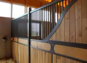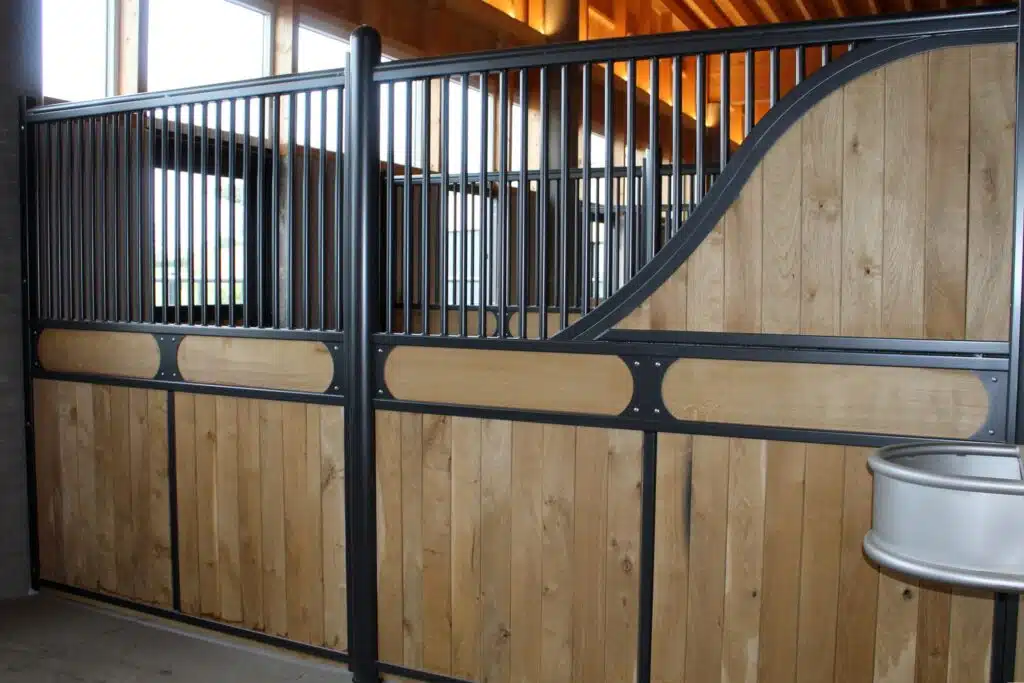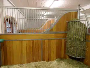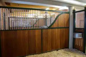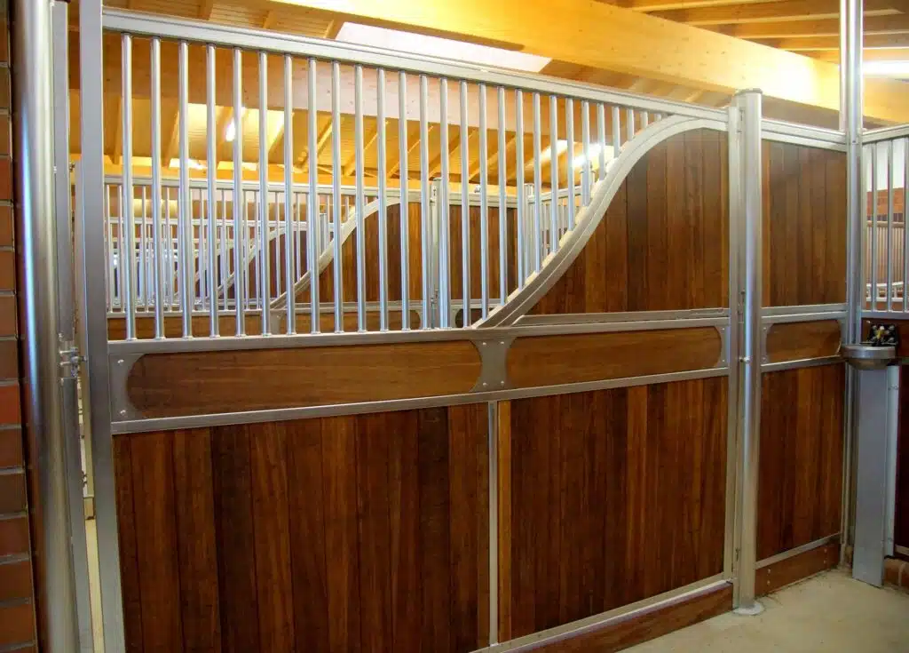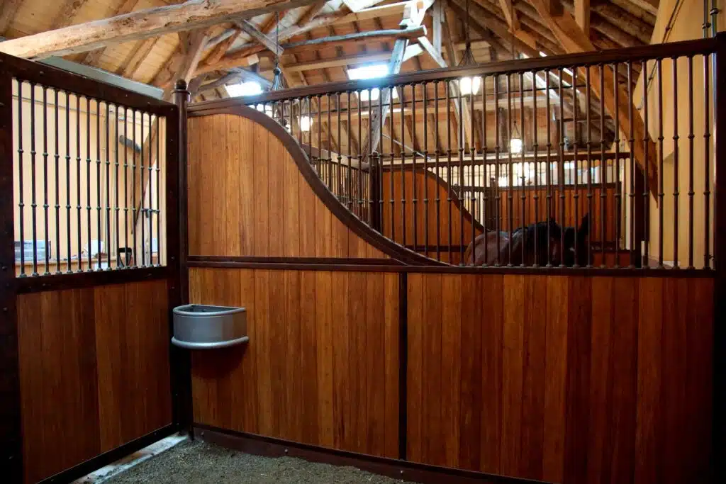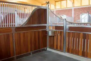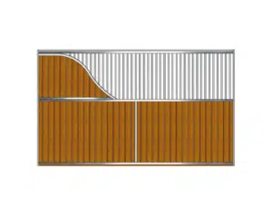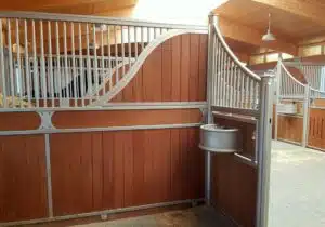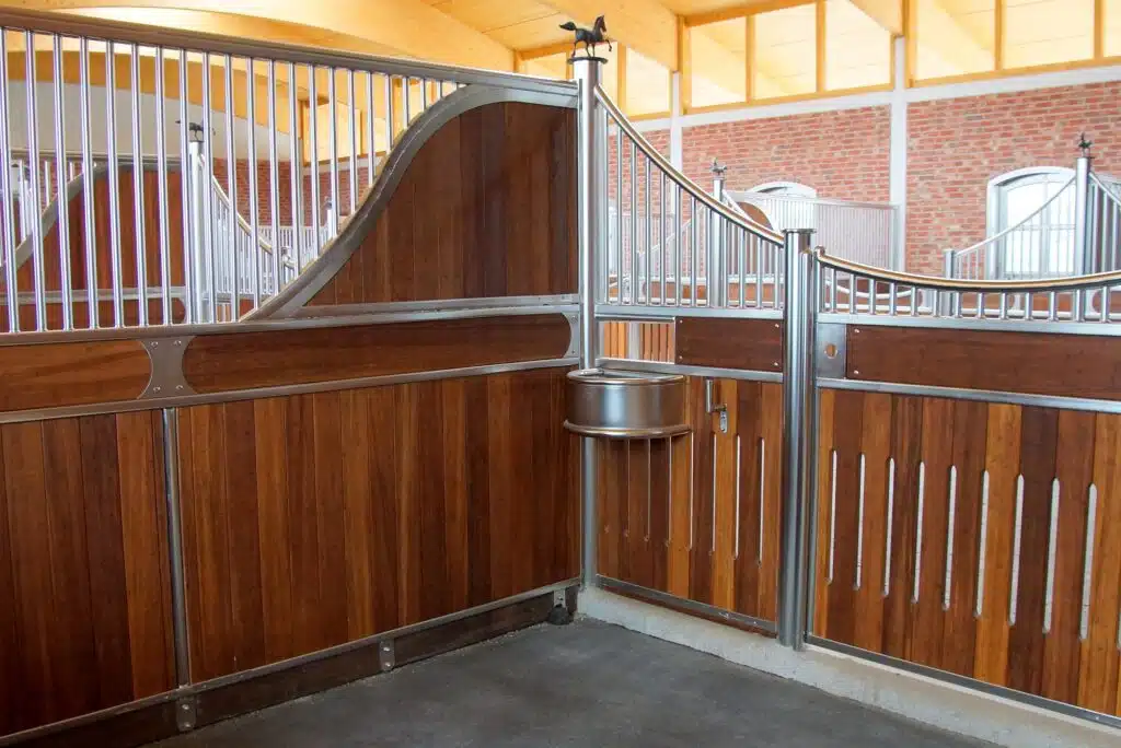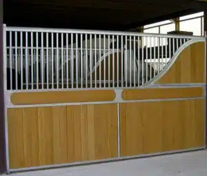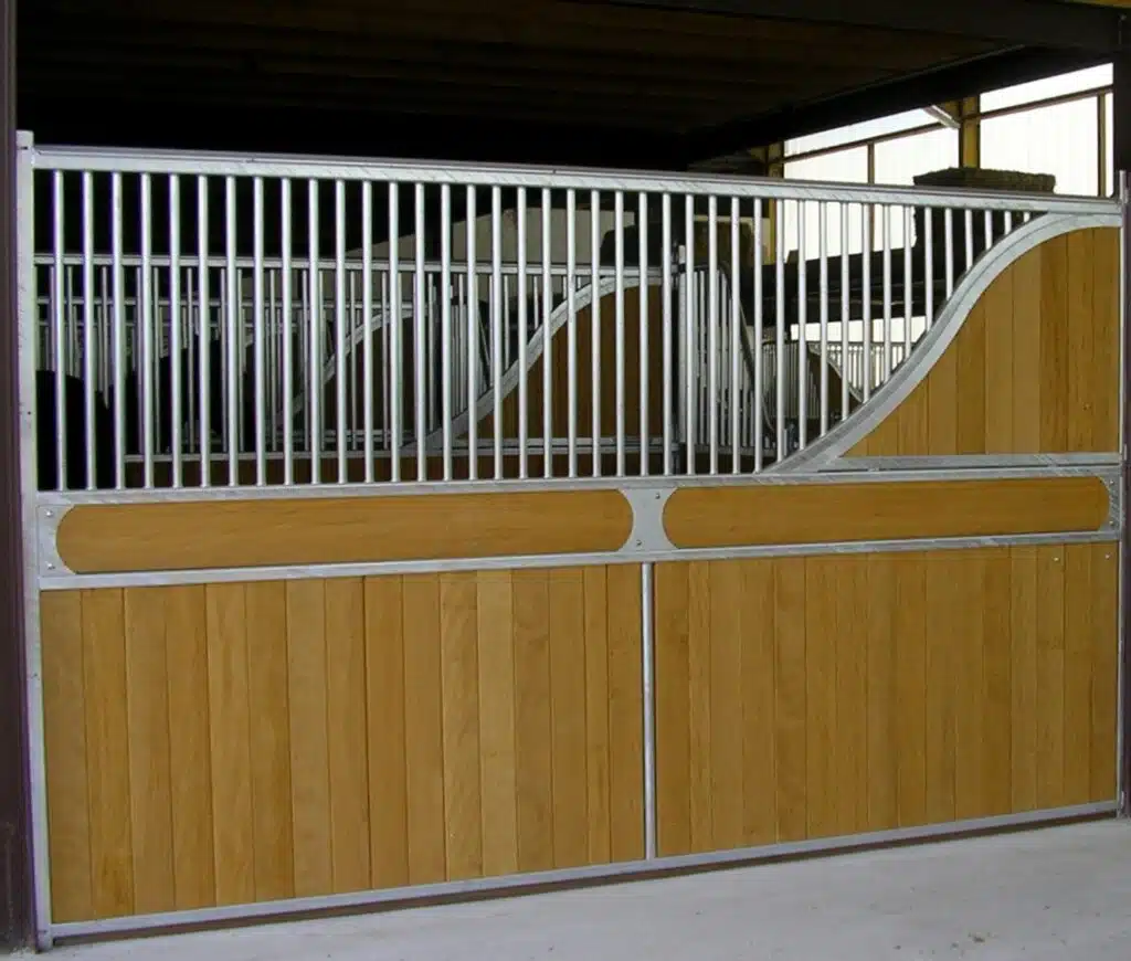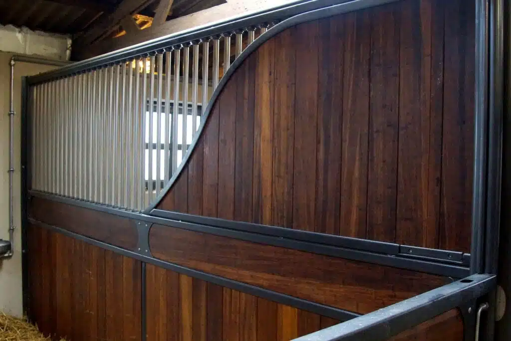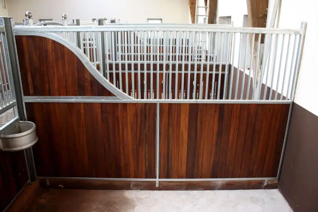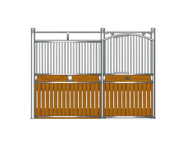 Entièrement réalisée sur mesure, cette séparation de box propose une solution haut de gamme idéale pour les écuries soucieuses de combiner esthétique, durabilité et confort du cheval. Elle s’adapte à toutes les configurations d’écurie et combine parfaitement aux façades de boxes de la même gamme.