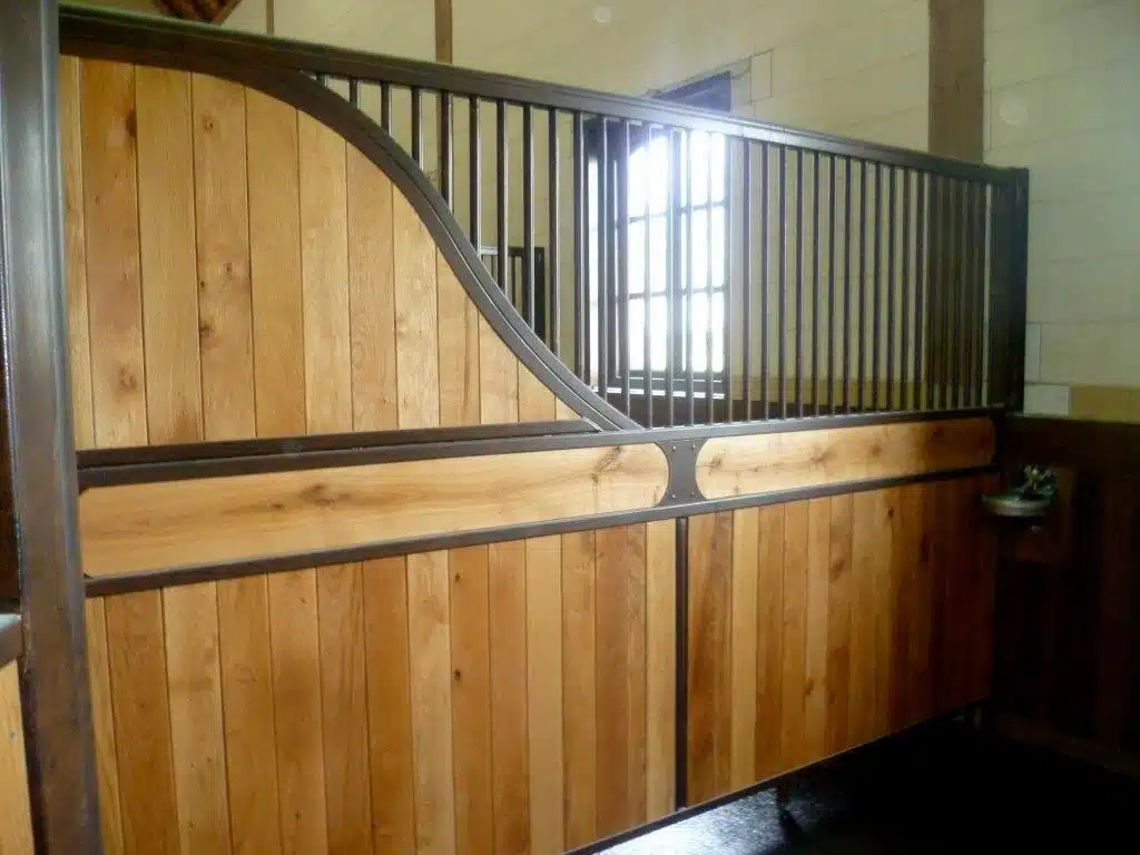 Séparation de box barreaudée et fermée sur 1 m avec galbe. Très esthétique et très robuste, cette cloison de box pour chevaux apporte du cachet à votre écurie et favorise le calme pendant les repas.