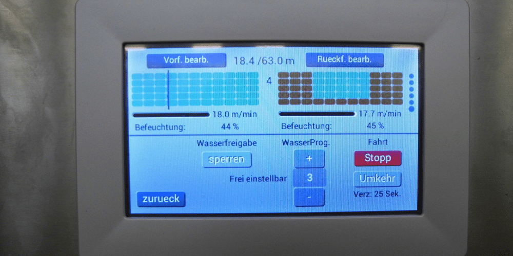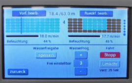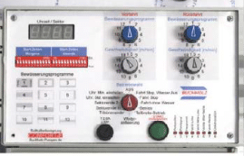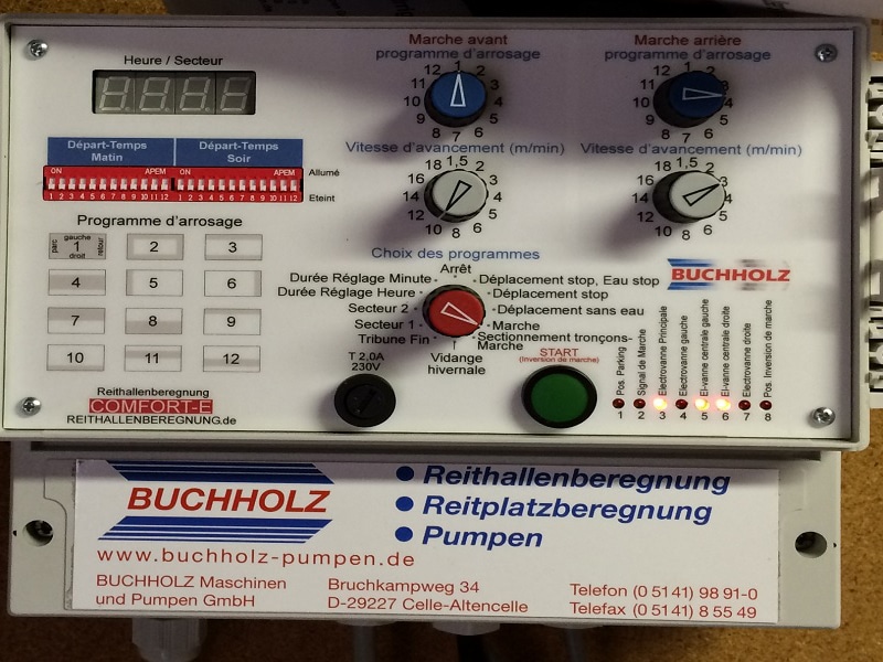 Le boîtier de contrôle (manuel ou avec programmateur) permet de régler la vitesse du système dans les deux sens et dans certains cas, d’arroser uniquement une partie de la piste. Par exemple, lors de différences de séchage du sol; par excès ou manque de lumière ou de courants d’air à certains endroits.